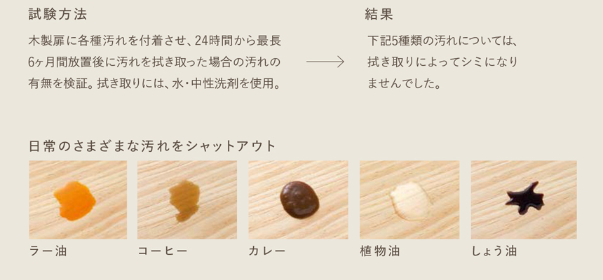 通常のお手入れは、乾拭き、または水拭きをして下さい。汚れがひどい場合は中性洗剤を含ませた布でふき取ってください。木がえの扉は、汚れに強い塗装がされています。お手入れが簡単で、長く安心してお使いいただけます。